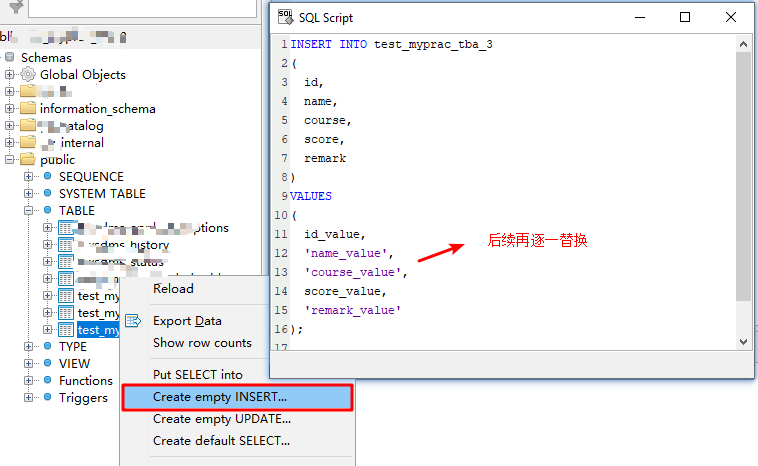 另外,在新定Insert语句时,除上述方式,也可事先生成Insert字段模板,再逐一替换:
