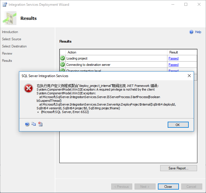 今日试验SSIS部署,没想到报错了,无论用SSDT或SSMS部署,最后都会报错:在执行用户定义例程或聚合"deploy_project_internal"期间出现.Net Framework错误……Error:6522,具体见截图: