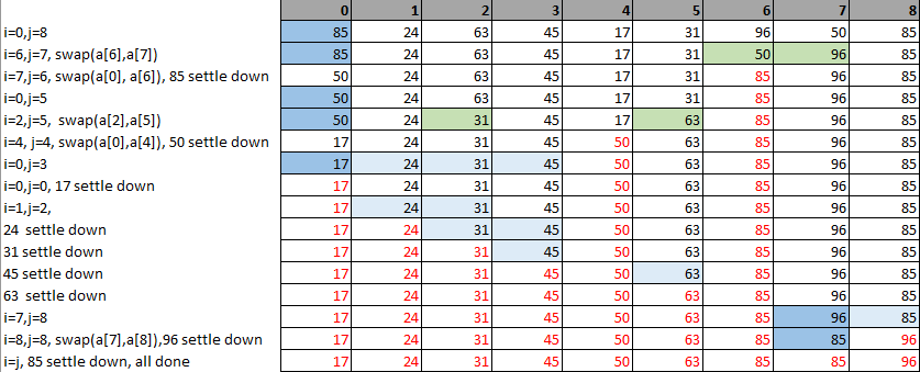 - 以上算法均以第一个元素作为pivot,需要先移动右边的指针,因为最后一次交换是pivot与ls[i]的交换,而pivot位于最左边,所以ls[i]不能大于pivot,否则交换之后ls[i]在最左边,却比pivot大,这显然是不正确的。反之如果算法将最后一个元素作为pivot,则需要先移动左边的指针。