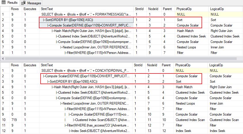可以看到预期结果的执行计划是先Sort再Compute Scalar,而非预期的则是先Compute Scalar再Sort。