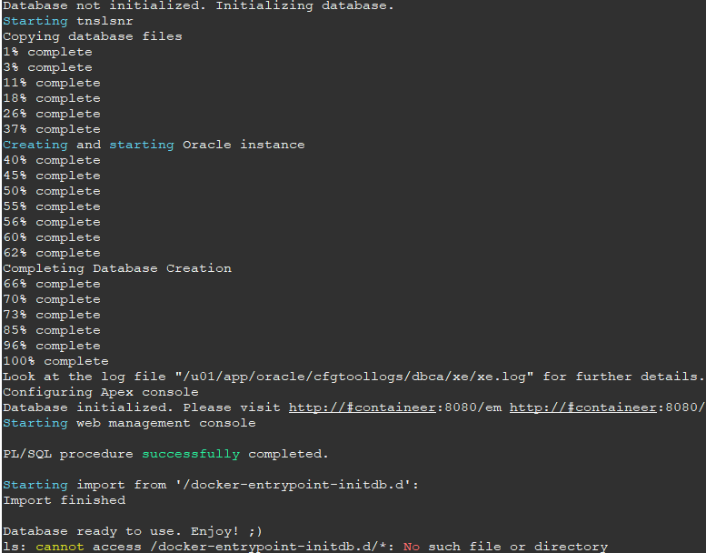 启动后运行命令 docker logs oracle-12c 可查看日志,日志中出现 Database ready to use. Enjoy! ;) 说明一切就绪,可以开始下一步