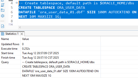 -- Create tablespace, default path is $ORACLE_HOME/dbs