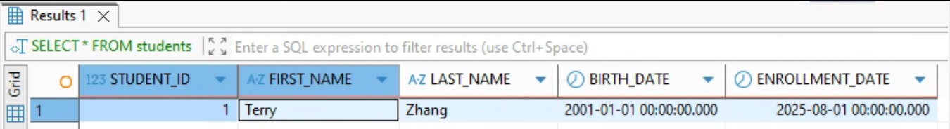 VALUES (1, 'Terry', 'Zhang', TO_DATE('2001-01-01', 'YYYY-MM-DD'), TO_DATE('20250801', 'YYYYMMDD'));